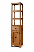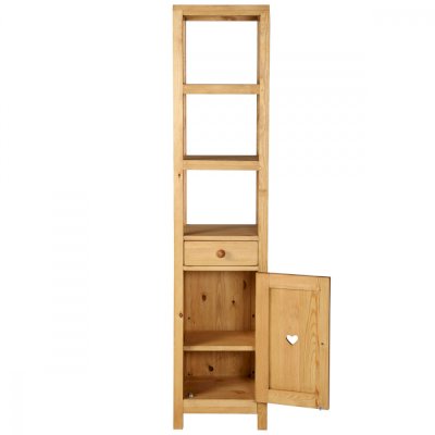 Открытый, сквозной пенал в верхней части. За дверкой одна полка. Выдвижной ящик.